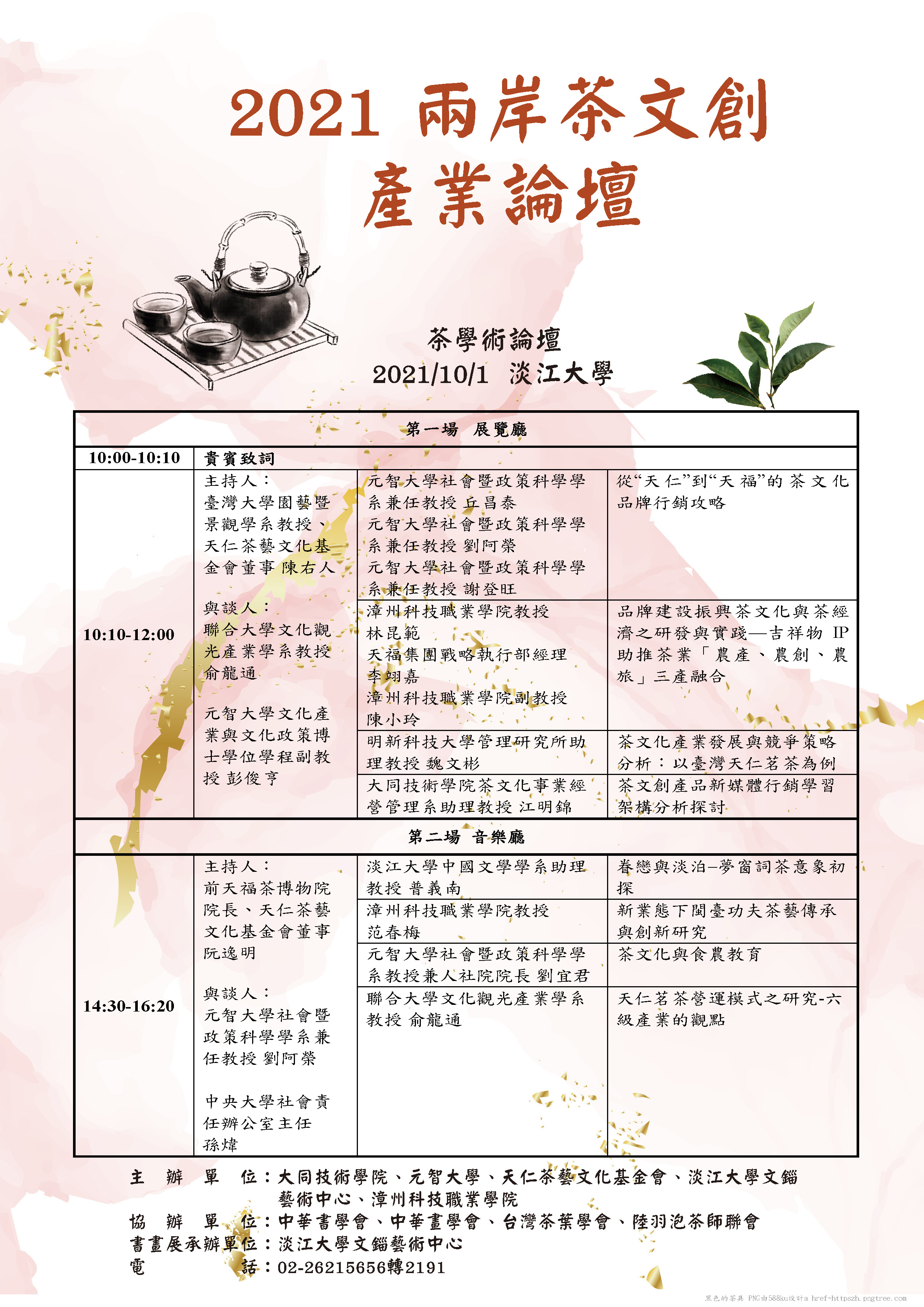 2021兩岸茶文創產業論壇 2021/09/07 活動日期:2021年10月1日 海報JPG檔:https://drive.google.com/file/d/1HlpWb6OKO8AvU7m9e09BVPMeAU8PZNbi/view?usp=sharing 報名網址:https://docs.google.com/forms/d/e/1FAIpQLSczUVxYIQe7eZgYrXxSCKlM4jdREo1iWoYb8AxvAfsTCkD5iQ/viewform?usp=sf_link Previous Article 上一篇 國立政治大學公共行政學系誠徵專任教師 Next Article 下一篇 國立台灣大學公共事務研究所將於2021年11月20日(星期六)以線上會議的方式舉辦地方治理論壇,邀請學界對地方治理相關議題有興趣之師生踴躍投稿參與