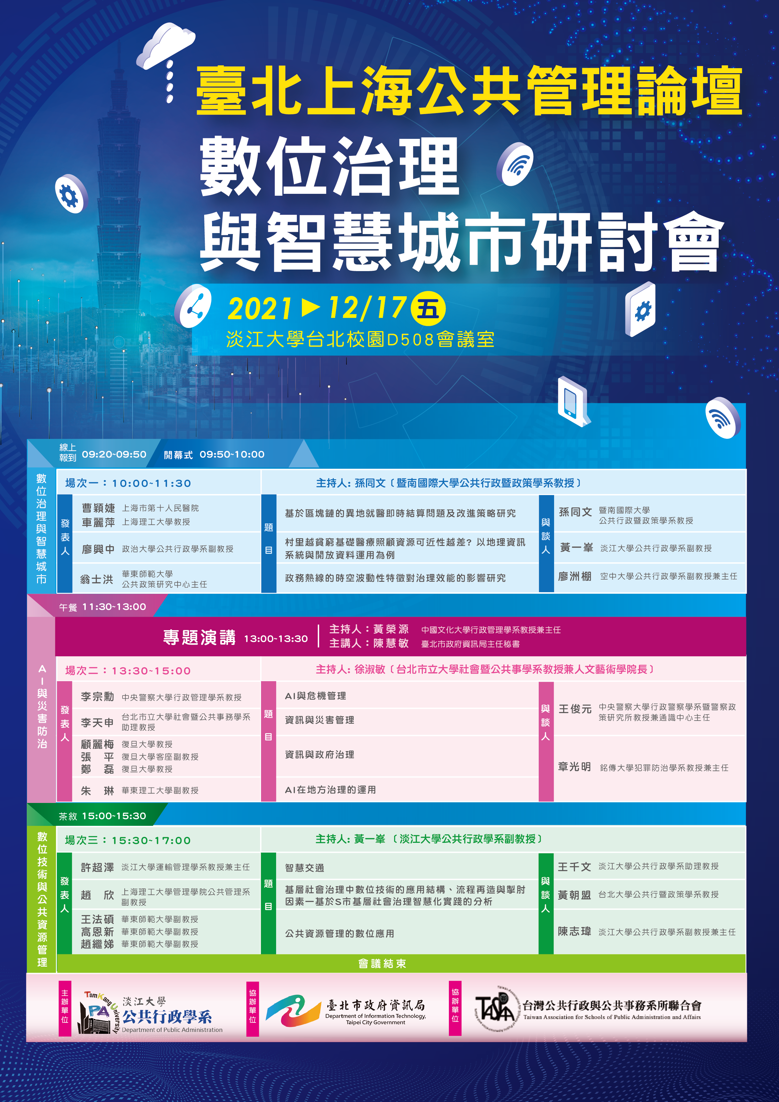 臺北上海公共管理論壇:數位治理與智慧城市研討會 2021/12/16 Previous Article 上一篇 【專題徵稿公告】2022年TASPAA年會與《行政暨政策學報》 「智慧政府與數位轉型」專題聯合徵稿 Next Article 下一篇 【請踴躍投稿】2022年第十七屆 TASPAA 徵稿公告
