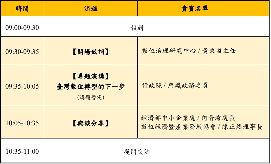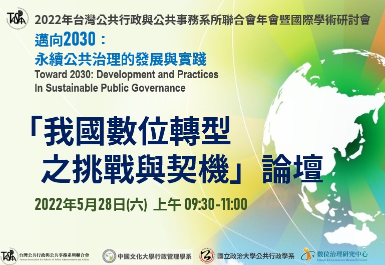 【訊息代發】「我國數位轉型之挑戰與契機」論壇 2022/05/15 「我國數位轉型之挑戰與契機」論壇 活動資訊公告 為推廣數位治理相關概念、鼓勵學術與實務界進行數位治理相關研究與交流,國立政治大學公共行政學系與數位治理研究中心將於TASPAA 2022年會第二日(05/28)辦理「我國數位轉型之挑戰與契機」論壇,邀請行政院唐鳳政務委員擔任演講貴賓,針對「臺灣數位轉型的下一步」進行線上演說,並安排經濟部中小企業處何晉滄處長、數位經濟暨產業發展協會陳正然理事長擔任與談人,期能促進公部門、產業界和學術界的交流對話。歡迎有興趣的師生及公務同仁一起參與。 論壇資訊 一、主題:我國數位轉型之挑戰與契機 二、時間:2022年5月28日上午9:30-11:00 三、地點:中國文化大學大孝館8F柏英廳(臺北市陽明山華岡路55號) 三、形式:線上直播和線下實體並行 四、報名網址:https://forms.gle/dpUMM2Z9cnNz4tH78 五、視訊連結:(活動前另行通知) 六、聯絡人:張專員(02)2939-3091 分機67526; 電子信箱:tegrdec@gmail.com 七、主辦單位:國立政治大學公共行政學系、數位治理研究中心 代為公告該活動資訊。詳細活動議程,請參閱公告之文件。 20220528我國數位轉型之挑戰與契機論壇_議程 Previous Article 上一篇 【訊息代發】第14屆國會學術研討會 Next Article 下一篇 【2022TASPAA資訊】個人論文、專題論文、自組論壇場次議程公布