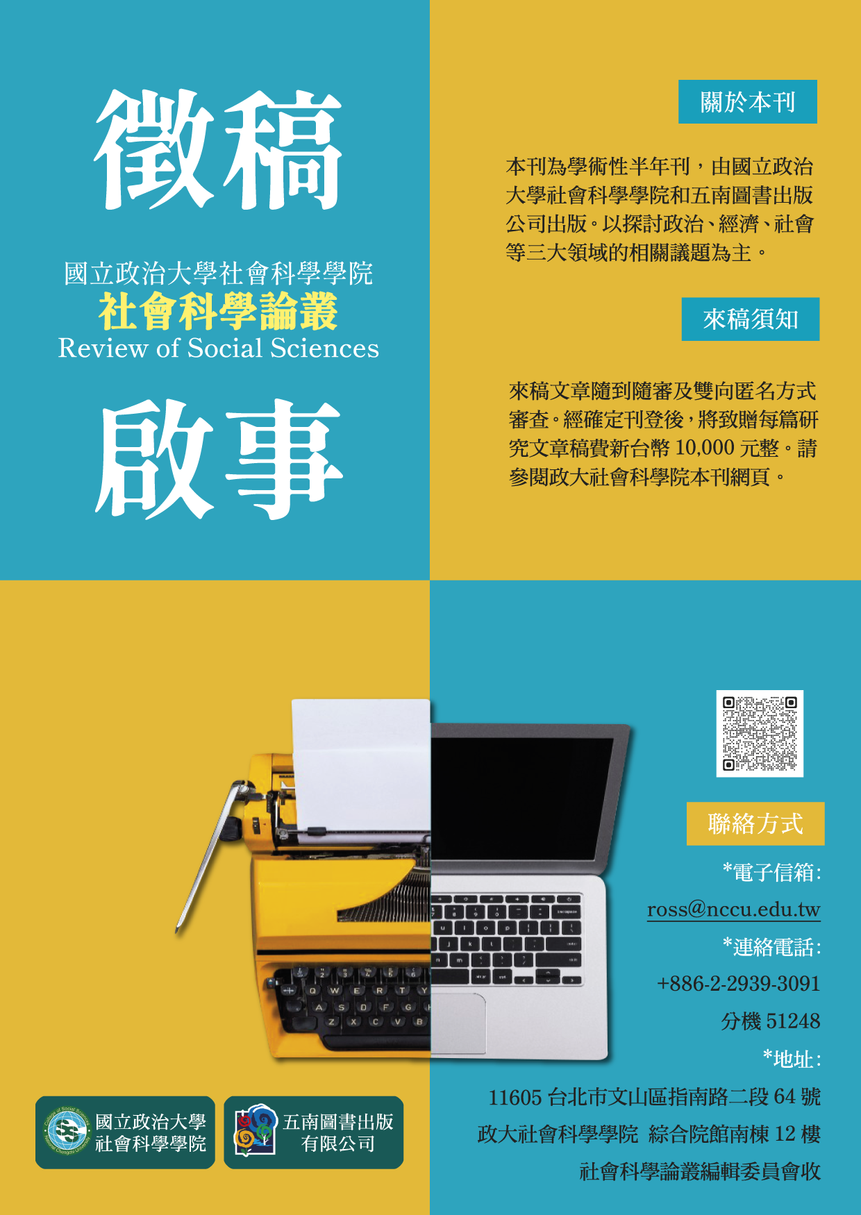 【訊息代發】《社會科學論叢》徵稿公告 2022/05/17 《社會科學論叢》 徵稿公告 《社會科學論叢》為一學術性半年刊,由政治大學社會科學院及五南出版社共同出版,每年6月及12月出刊,以探討政治、經濟、社會三大問題為宗旨。有鑑於跨領域的研究為未來學術研究的趨勢,本刊希望成為社會科學跨領域研究的交流平台。因此,歡迎社會科學跨領域的研究文章投稿。本刊經確定刊登後,將致贈每篇研究文章稿費新台幣10,000元整。 投稿相關須知、格式體例等詳細資訊可參見此網站(https://reurl.cc/rDr8LO)。 投稿相關問題洽《社會科學論叢》編輯委員會 連絡電話:(02)29393091分機51248 E-mail:ross@nccu.edu.tw Previous Article 上一篇 【重要訊息通知】2022第十七屆TASPAA年會暨國際學術研討會延期公告通知 Next Article 下一篇 【訊息代發】第14屆國會學術研討會