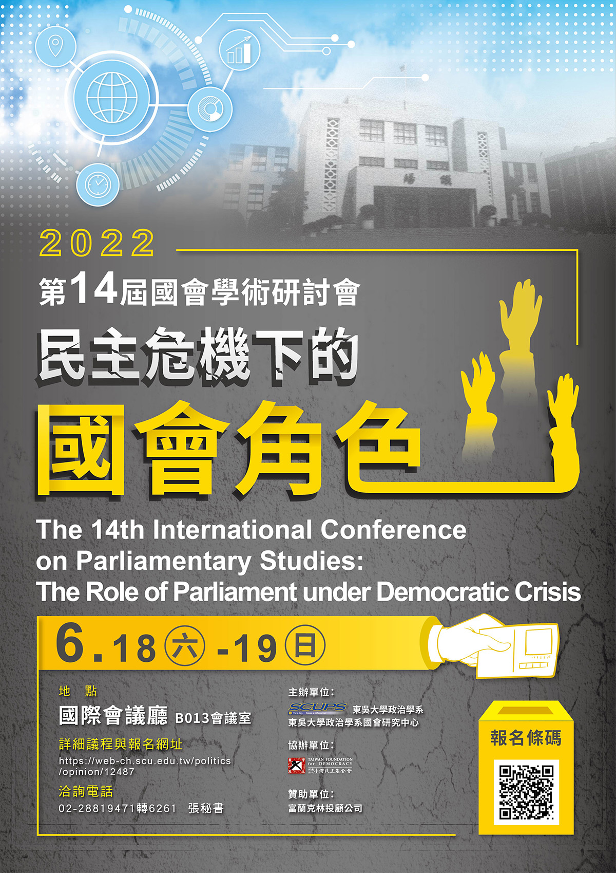 【訊息代發】第14屆國會學術研討會 2022/05/17 第14屆國會學術研討會 會議資訊公告 各位學術界先進您好: 近兩年來新冠疫情壟罩全球限制了各種行動,在看到脫離疫情曙光的此刻,卻也看見各國民主面臨或大或小的挑戰。在政治民粹強人風潮席捲全球後,新一波的民主危機和挑戰開始浮現,包括老牌和新興國家的民主體制都遭遇動盪,受矚目的事件大者如2021年元月,美國國會山莊史無前例地遭到政治抗議人士佔領並造成傷亡。同年2月緬甸軍事政變推翻民選的全國民主聯盟,由軍方重新主導政局。8月時阿富汗因美國撤軍,導致原來的民選政府垮台,阿富汗重回到塔利班宗教勢力的控制。較小的事件如德國與捷克分別在9月和10月完成國會大選,但政黨如何結盟、如何組閣分配職位,曾一度引起關切,也可視為另一層次的民主挑戰。民主的運作並非總是一帆風順、偶遇波折甚至大風大浪都不足為奇,關鍵是如何減少危機、如何迅速化解危機、如何重新回復民主運作的常軌。 緣此,第十四屆國會學術研討會的主題訂為「民主危機下的國會角色」,從各種角度視野審視民主與國會的諸多議題,討論民主危機的起因與解決對策。在民主與國會的主題下,研討會廣納多元的分析資料與方法,希冀觸發更多的思考與討論。 東吳大學政治學系國會研究中心將在2022年6月18、19日(星期六、日)於東吳大學外雙溪校區廣邀海內外學術界共同進行研討與交流。此次研討會共有32篇學術論文參與發表,分為11個場次,發表人及評論人來自國內外各學術研究單位,期望此一學術研討會平台,提供溝通交流之機會,並開發更多的研究議題,促進合作的可能。 1. 會議時間:2022年6月18-19日 (星期六、日) 2. 會議地點:東吳大學外雙溪校區(國際會議廳 / B013研討室) 3. 主辦單位:東吳大學政治學系 / 東吳大學政治學系國會研究中心 4. 指導單位:財團法人台灣民主基金會 / 富蘭克林投顧公司 5. 報名截止時間:2022年6月10日(星期五)中午12:00 6. 研討會議程:https://web-ch.scu.edu.tw/politics/opinion/12487(如有更新,會立即更換) 7. 本次會議將隨疫情狀況調整舉辦方式(目前暫訂實體進行),敬請隨時注意最新消息。 8. 報名網址:https://forms.gle/aUG4yvX41bsEHdeTA 東吳大學政治學系國會研究中心敬上 2022.05.17 Previous Article 上一篇 【訊息代發】《社會科學論叢》徵稿公告 Next Article 下一篇 【訊息代發】「我國數位轉型之挑戰與契機」論壇