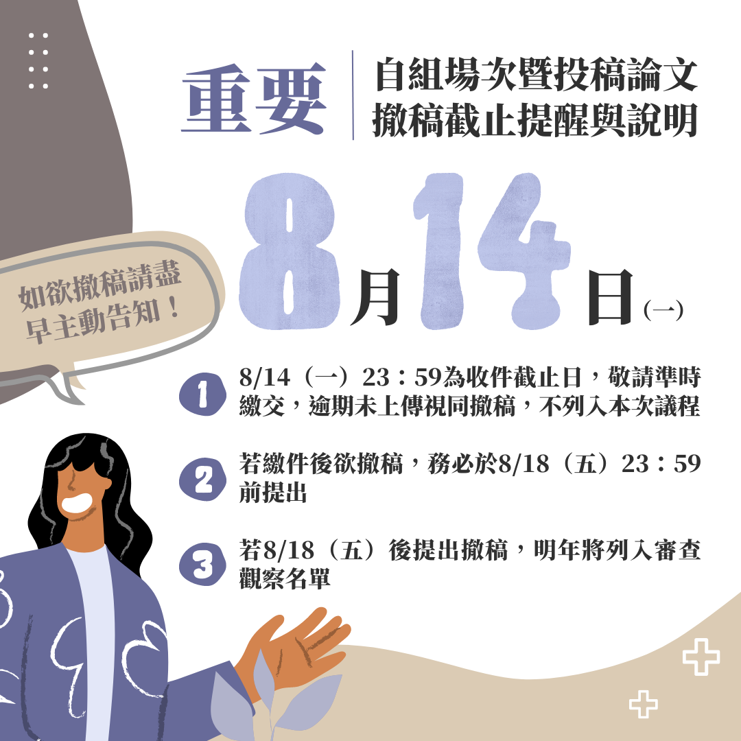 一、上傳繳件後如欲撤稿,務必於8/18(五)23:59前通知大會秘書處。逾期將依理監事會議決議,公告名單於TASPAA官網。