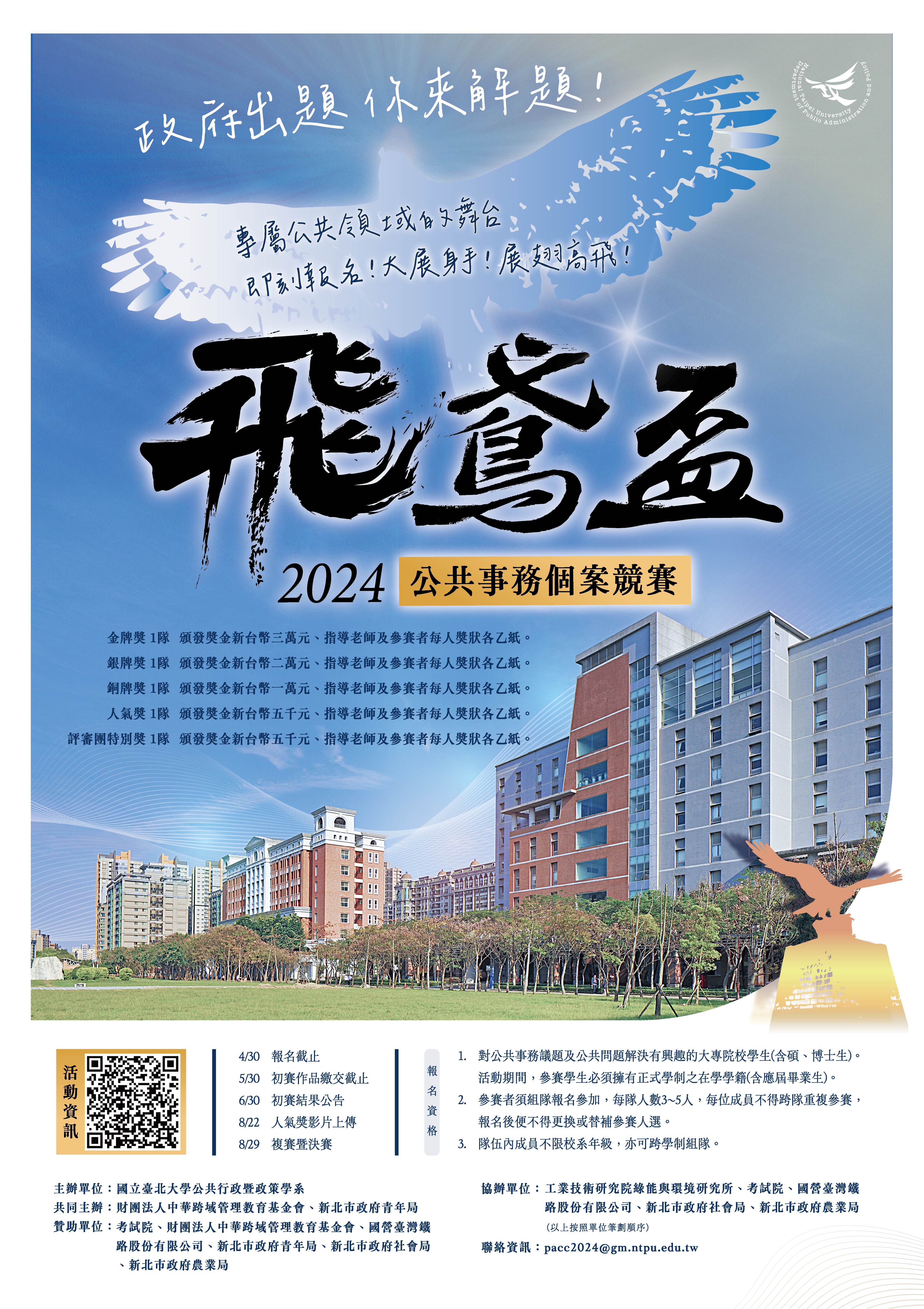 【訊息代發】2024第三屆PACC飛鳶盃公共事務個案競賽報名開始 2024/04/11 2024第三屆PACC飛鳶盃公共事務個案競賽 開始報名囉 想實踐所學專業技能、增加跨域合作能力嗎 想發揮創意為政府部門提供棘手問題的解方 想為自己的履歷加分,具有專案實績 PACC飛鳶盃公共事務個案競賽將是你大展身手的舞台! - PACC飛鳶盃兩大亮點 1. 國內首創以公共事務為主題的個案競賽: 打破國內個案競賽多以商業行銷、企業經營等主題為核心的型態,本競賽以與日常生活息息相關的「公共事務」為競賽焦點,提供對公共行政與公共事務有興趣的大學院校學生,得以盡情揮灑專長的舞台。 2. 來自公共組織的「真實棘手問題」: 透過實際參與公部門面臨問題的解決方案構思,並結合所學專業知能及團隊創意,提供政府部門創新性解方的可能,促使政府政策與公共服務更契合社會需求。 報名資訊 報名時間:3/18~4/30 報名資格:全國大專院校學生(含碩、博士生),活動期間需擁有在學學籍(含應屆畢業生) 報名限制:每隊僅一次報名機會,確認送出後即無法修改 官方網站: https://sites.google.com/view/paccofficial IG: https://www.instagram.com/pacc_case_competition...... 信箱: pacc2024@gm.ntpu.edu.tw Previous Article 上一篇 【2024TASPAA資訊】現場報名&參加時數證明資訊 Next Article 下一篇 【訊息代發】國立臺灣大學政治學系徵聘專任教師 公告