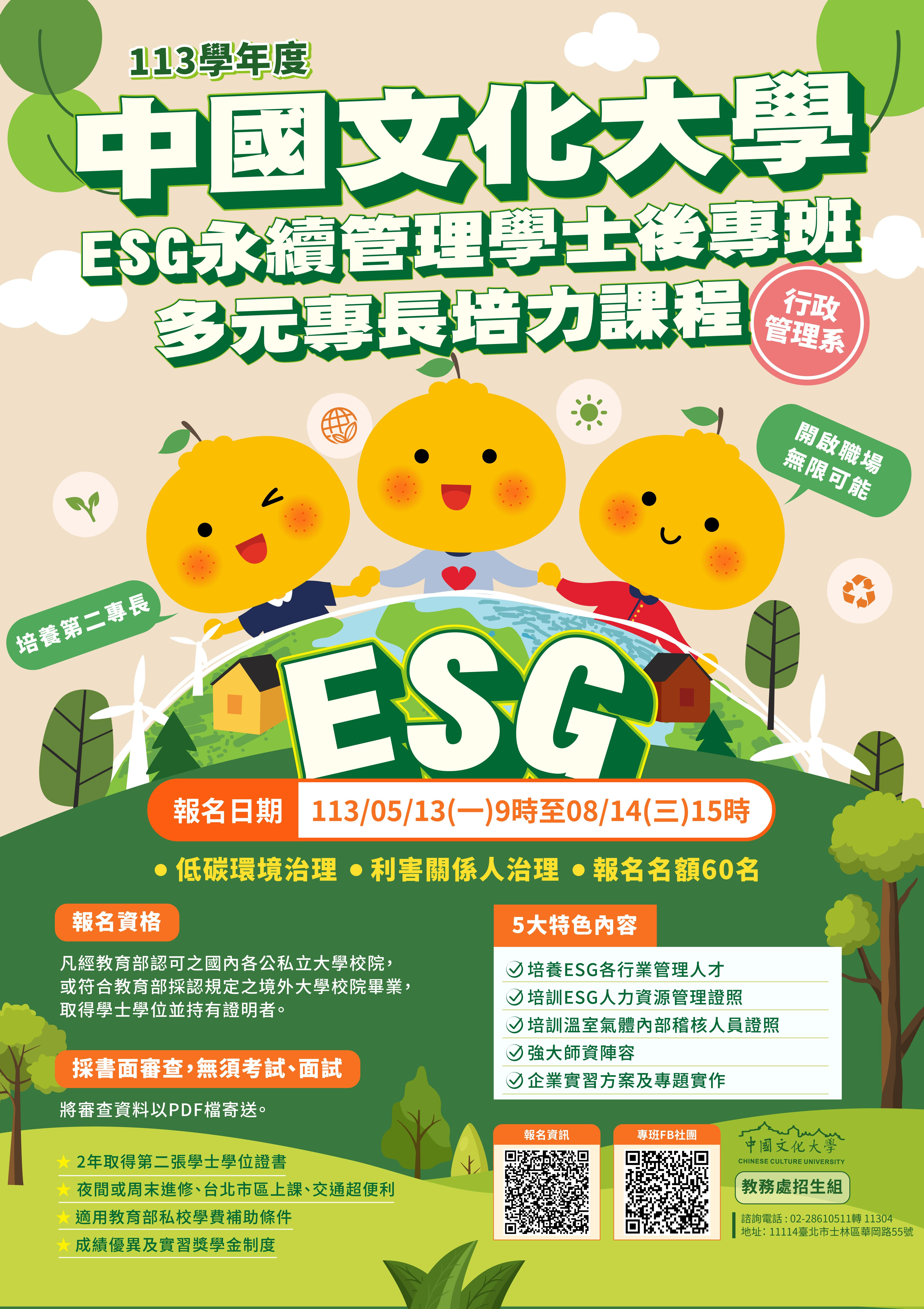 【訊息代發】中國文化大學113 學年度學士後多元專長培力方案–ESG永續管理專班開始招生 2024/05/18 教育部核定113 學年度日間部學士後多元專長培力方案: 「中國文化大學113 學年度學士後多元專長培力方案–ESG永續管理專班開始招生! 檢附招生海報及簡章檔案,歡迎加入永續管理行列!」 學士後多元專長培力方案(ESG專班)簡章pdf.pdf Previous Article 上一篇 【訊息代發】國立政治大學數位治理研究中心舉行「數位治理研析成果發表會」 Next Article 下一篇 【2024 TASPAA】關注震災重建籲政府全力支持東華大學