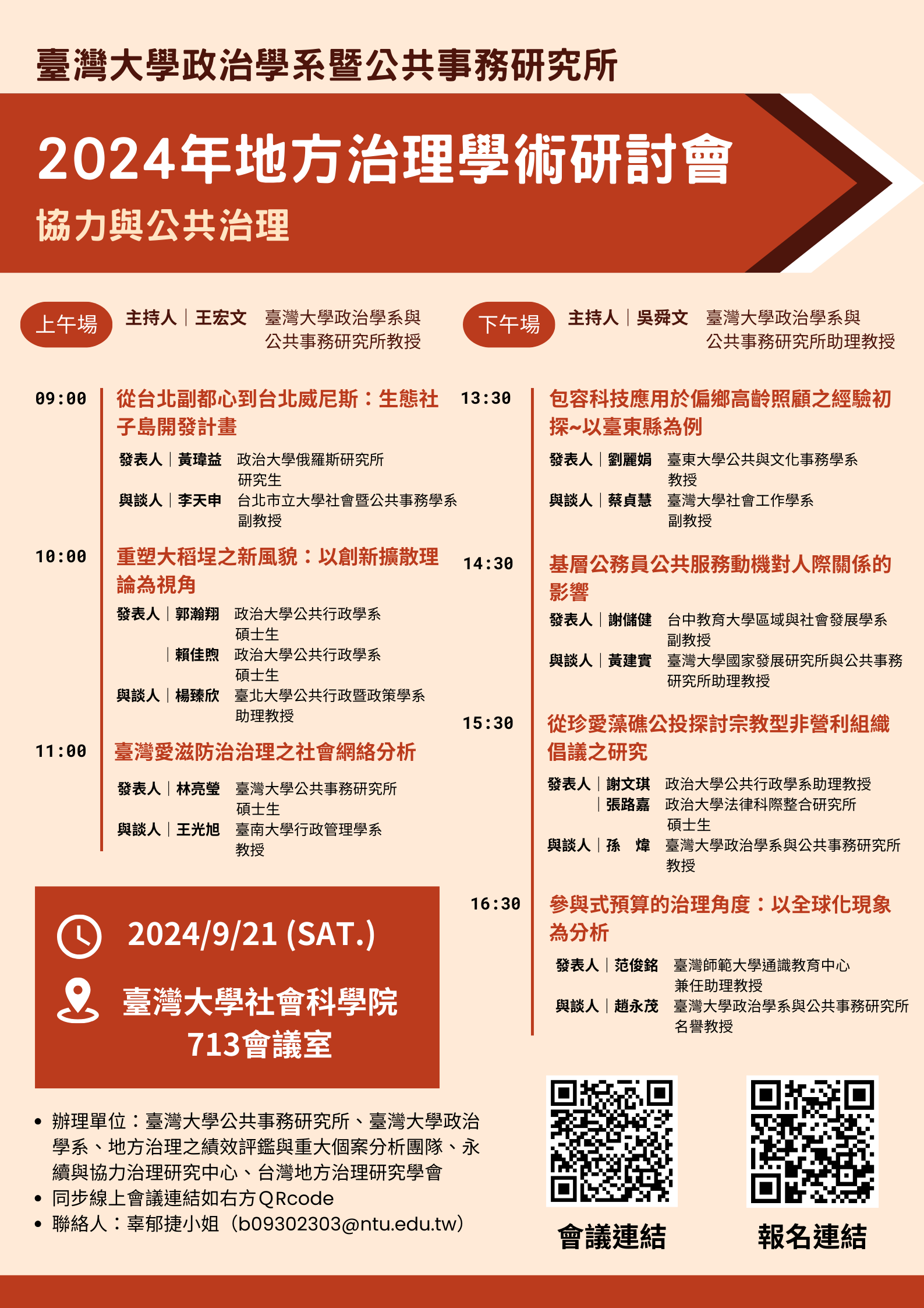 【訊息代發】「2024年地方治理學術研討會:協力與公共治理」即日起開放報名,歡迎您共襄盛舉! 2024/09/03 「2024年地方治理學術研討會:協力與公共治理」即日起開放報名,歡迎您共襄盛舉! 報名連結:https://docs.google.com/forms/d/e/1FAIpQLSdoxHlagm2UVlNuLNIA9cmfNFVsr7b5vwwO1D3RlB7APV1qnA/viewform?usp=pp_url 【本研討會簡介】 本次研討會著重探討協力治理對於政府績效之影響,希望藉由協力治理之各項主題(包含府際與府會關係、協力治理之模式、良善治理、網絡治理等),探究提升地方政府治理績效之契機,並增進相關學術理論之建構以及地方實務之精進。希望藉由本次研討會之發表以及深度討論,強化協力治理之運作模式並提升地方政府之治理效能! 【相關資訊】 時間:2024年09月21日(星期六) 地點:國立台灣大學社會科學院 713會議室 研討會議程:https://drive.google.com/file/d/1zWqZV6zzUgsPYT4y6eags3Ayf7malla8/view?usp=sharing 主辦單位:臺灣大學公共事務研究所、地方治理之績效評鑑與重大個案分析團隊、台灣地方治理研究學會 如有任何問題,請聯絡辜小姐:b09302303@ntu.edu.tw Previous Article 上一篇 【請踴躍投稿】2025第二十屆 TASPAA 國際學術研討會徵稿公告 Next Article 下一篇 【訊息代發】2024社會暨公共事務國際學術研討會「AI時代公共人力資源管理的精進策略工作坊」徵稿啟事